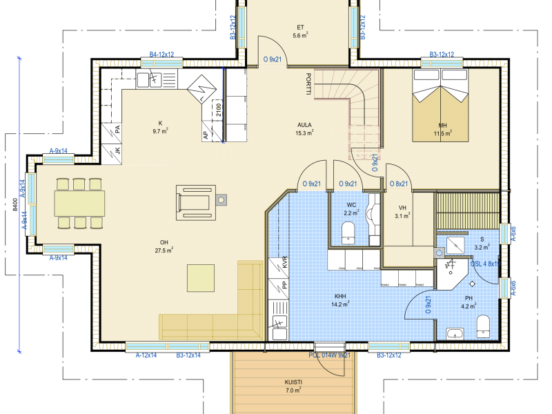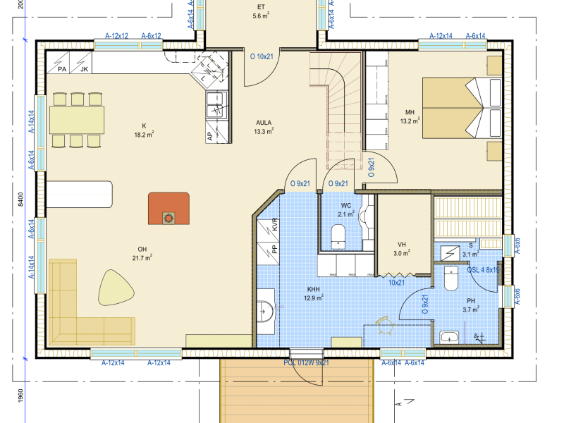 Isot ja avarat tilat, niin makuuhuoneissa kuin muissakin huoneissa, tekevät talosta kodin jossa nauttii elämästä ja arjesta. Tyylinsä puolesta AHVENNIEMI soveltuu erinomaisesti niin maaseudulle kuin jo rakennetulle asuinalueelle kaupunkiin.